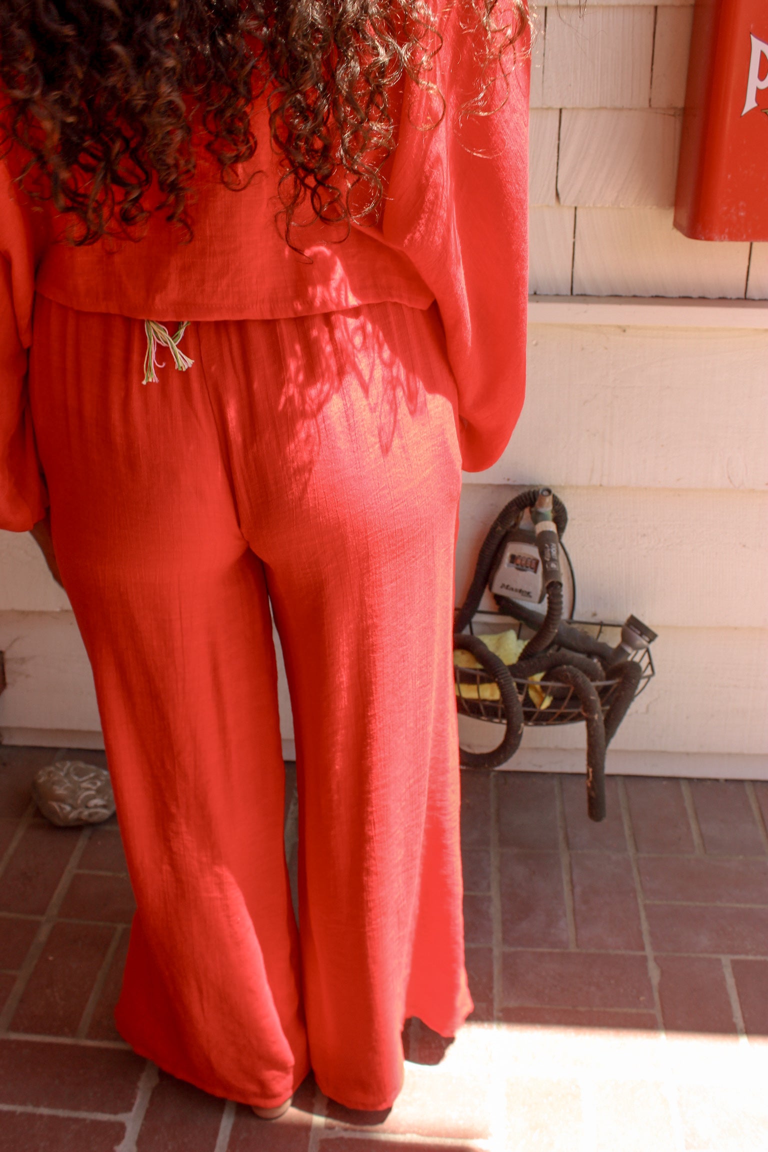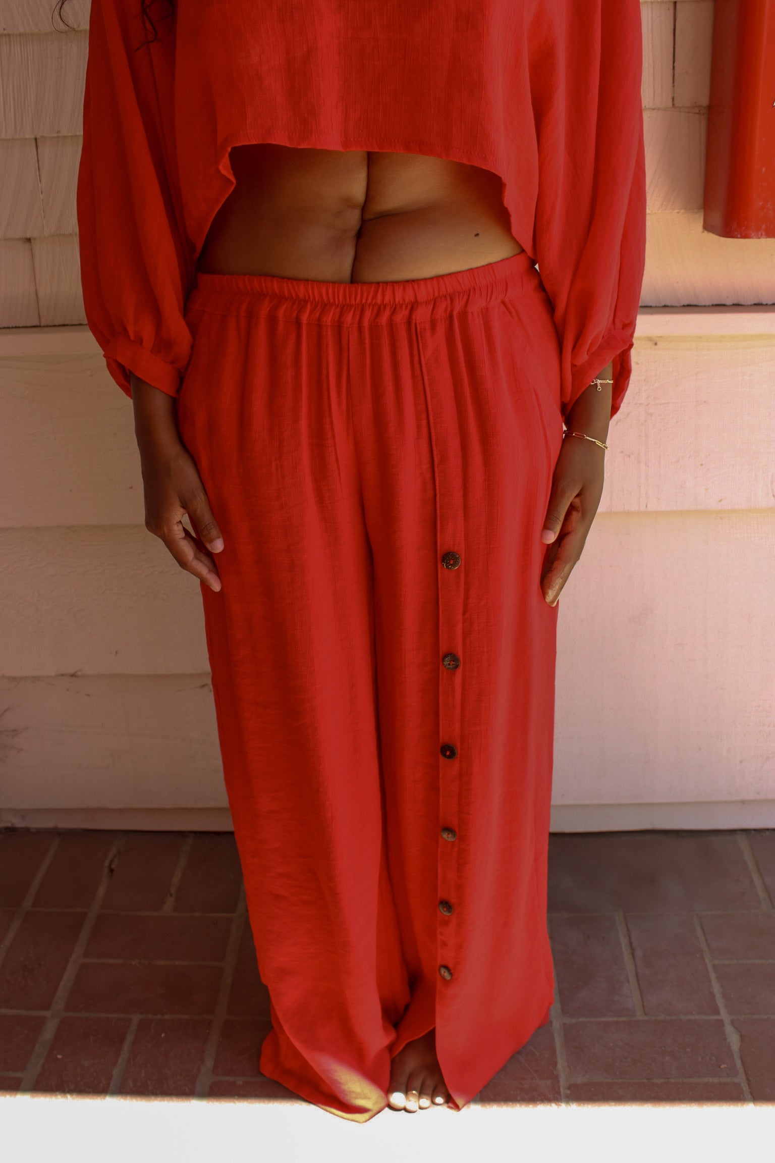 These super cute pants have an elastic waistband and buttons down the left leg. Available in Real Red