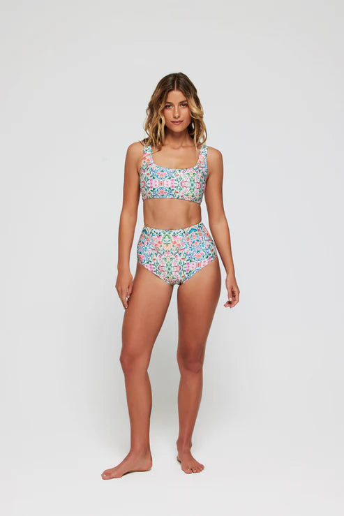 Look stunning in the Carrie Two-Piece Swimsuit Top featuring a flattering scoop neck and eye-catching Bella Piastrella print. Dare to blossom and soak up the sun in this sultry swim top; be the center of attention at the beach! Pair with the Mackenzie Bottoms.