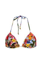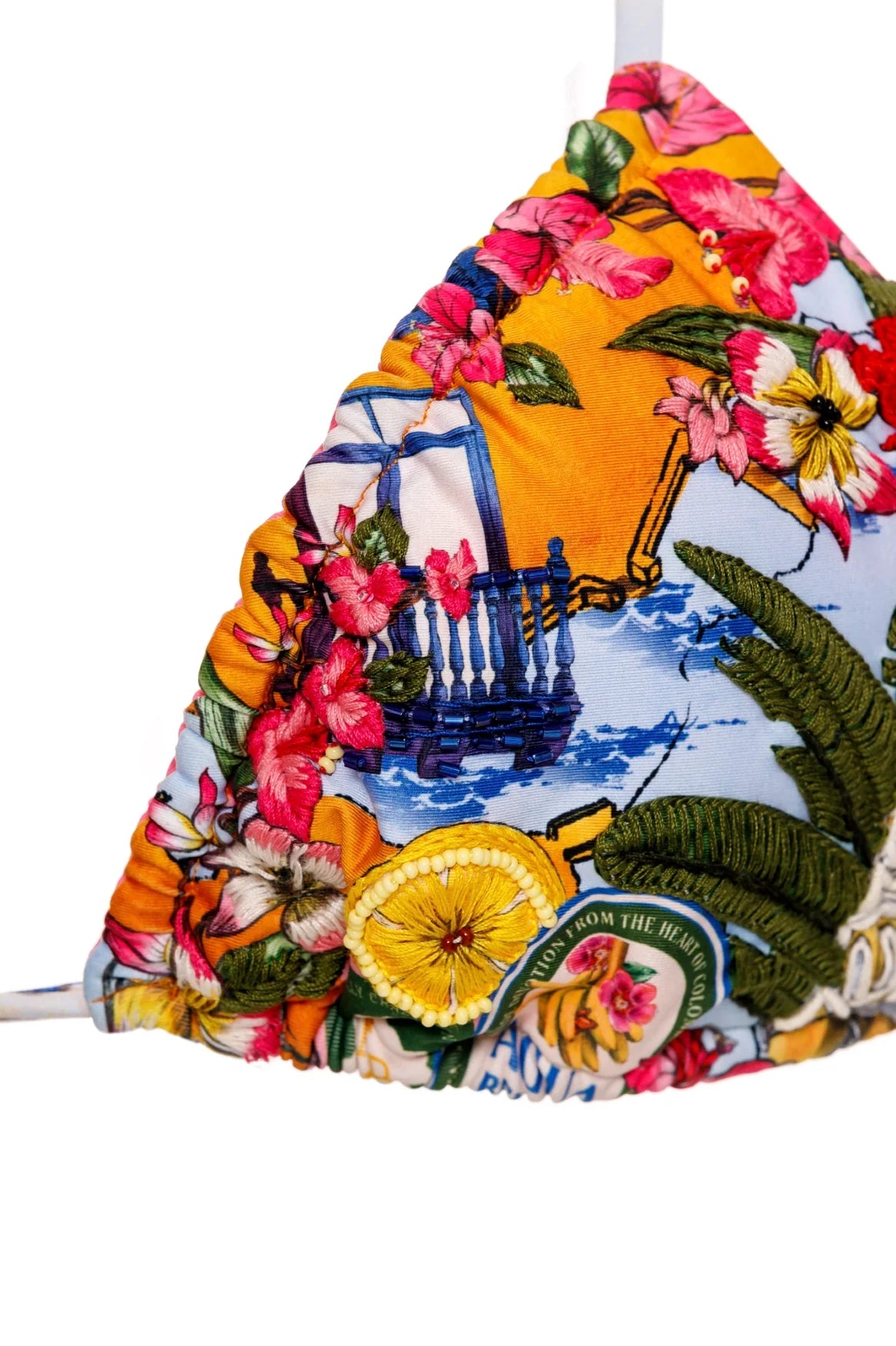 The Valle Bikini Top features intricate hand-embroidered details and a flowery reversible print, celebrating the lively essence of Cartagena. With adjustable tie straps for a custom fit, this unique piece blends comfort and cultural artistry, perfect for sunny beach days.