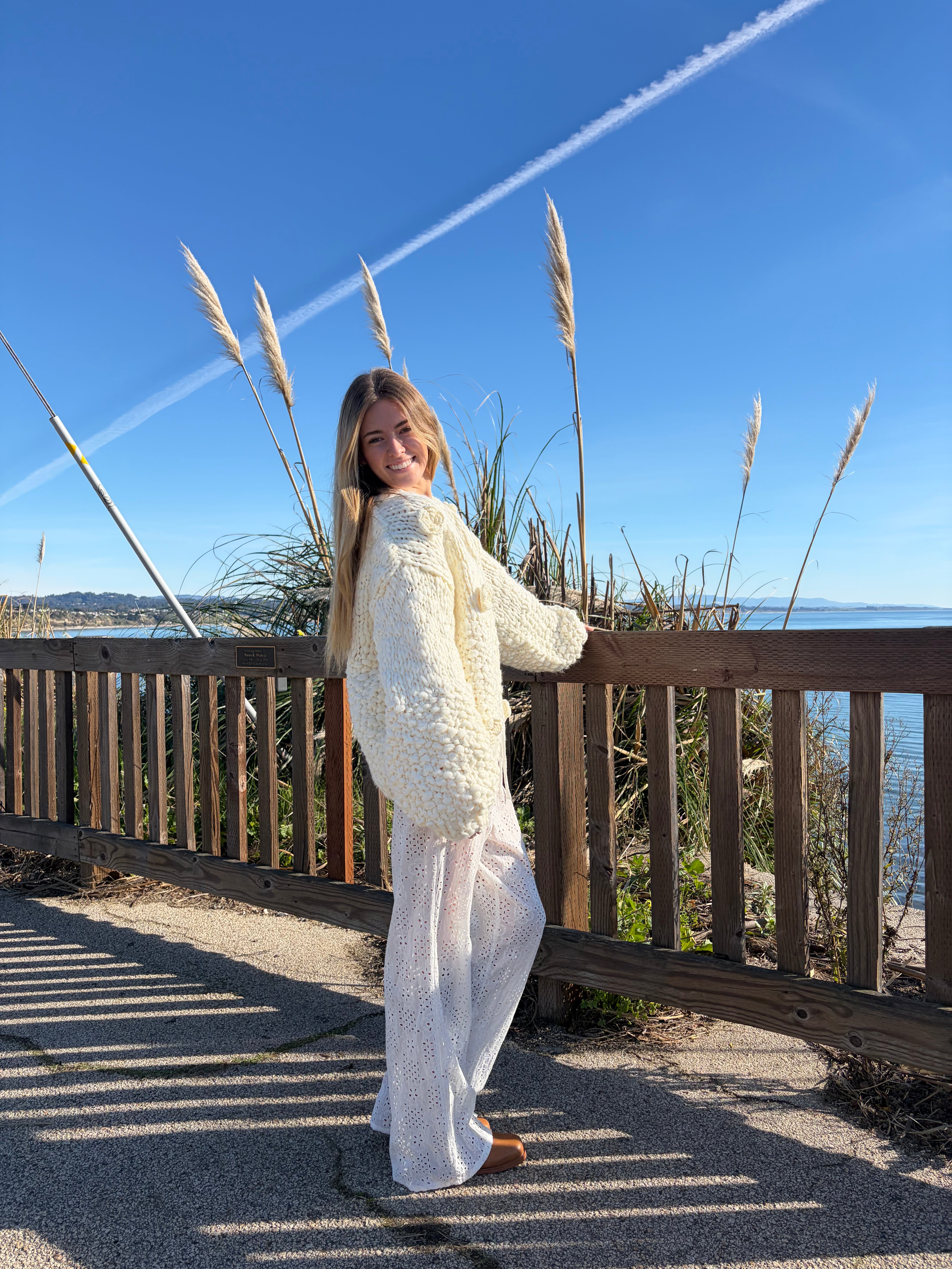 The Hazel Sweater is a chunky knit cardigan with tonal floral appliqués, designed to keep you chic and cozy. This open cardigan is perfect for layering over a dress or top and pairs effortlessly with jeans or skirts for an elevated casual outfit.