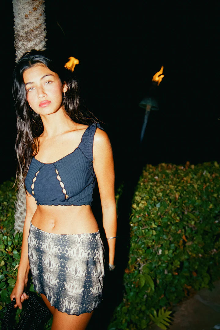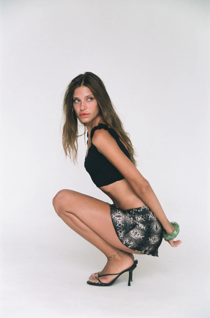 Kiki mini skirt in Black Viper. Crafted with luxe mesh soul eco - the ultimate micro mini with an edge. Similar to the iconic JLO Gown feel you know and love this time in a micro mini length, a-line silhouette style. Pull on elastic waist designed to sit daringly low on the hips. Pair with the Penny top in black to turn heads and break hearts. Fit runs true to size. Lifestyle model Meeya wears size S. Studio model Danaya wears size S.
