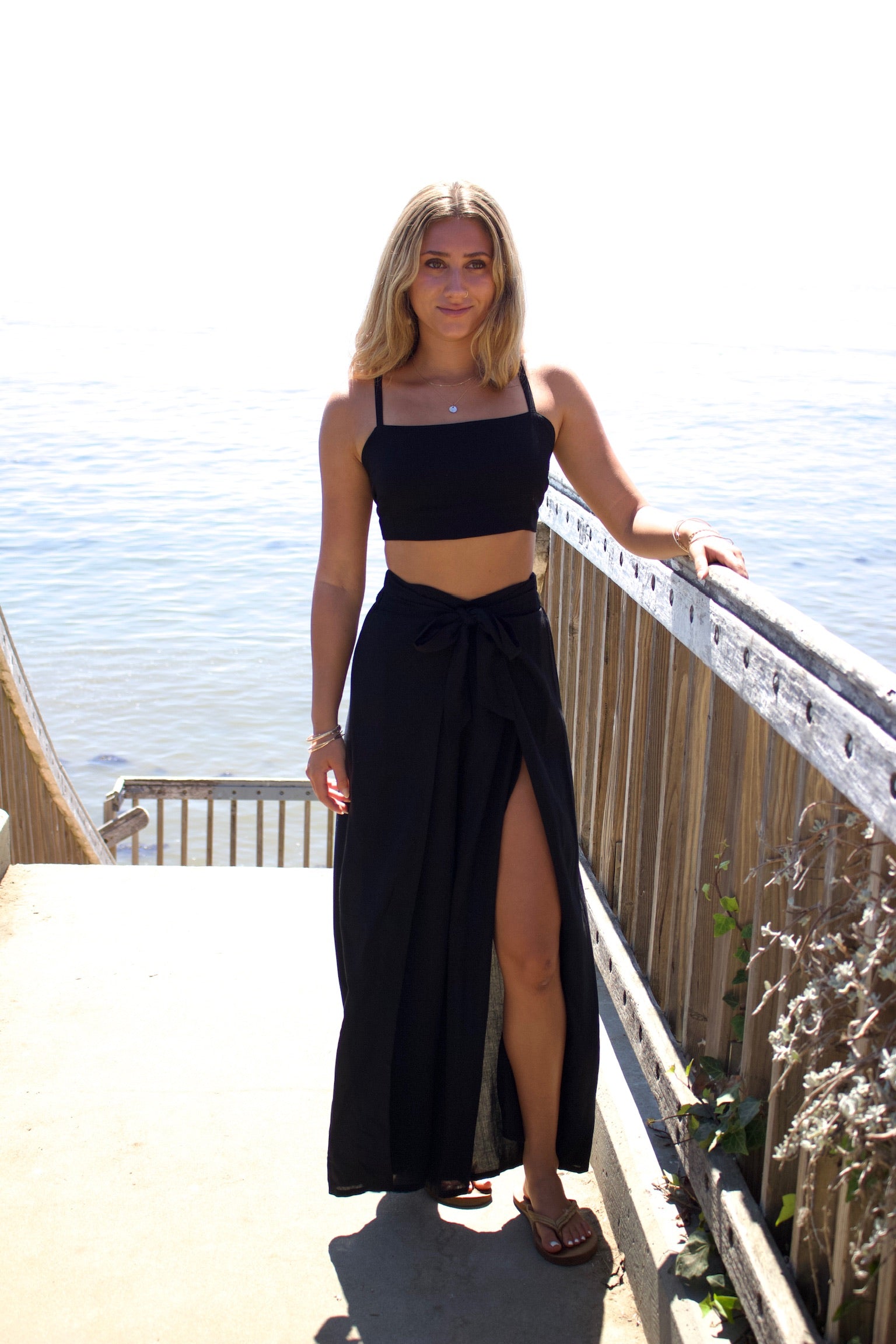 Long black flowy pants that wrap in the front.
