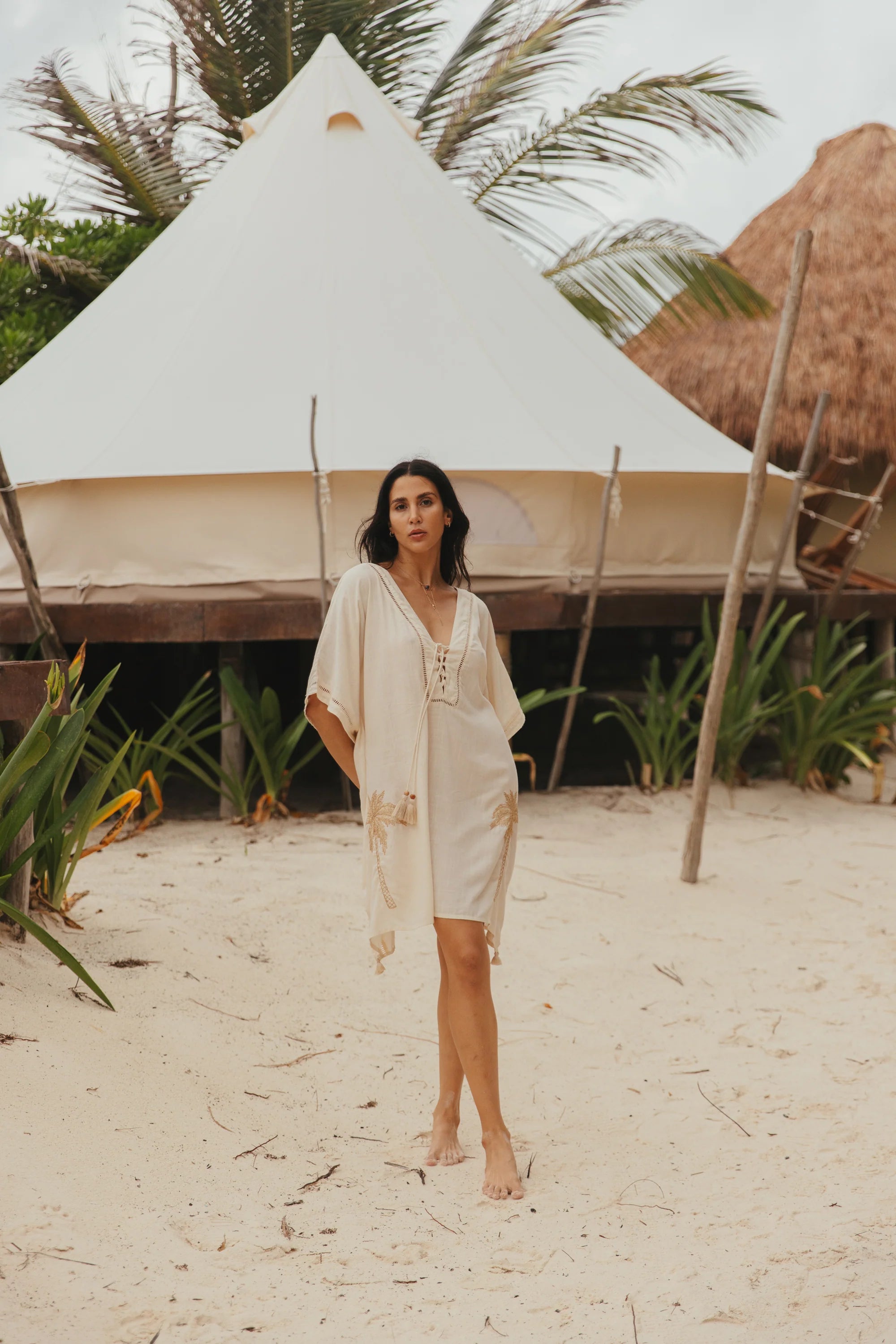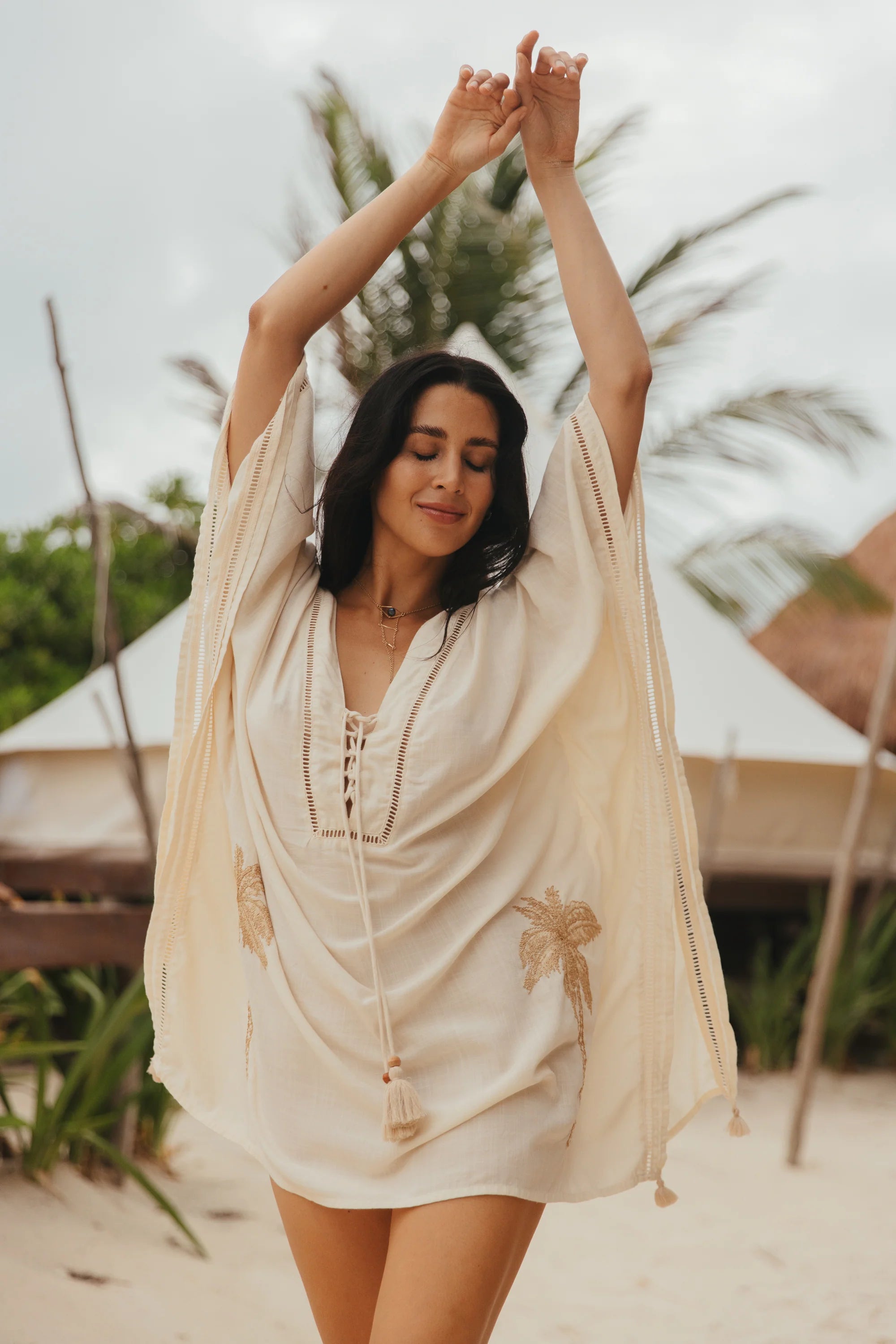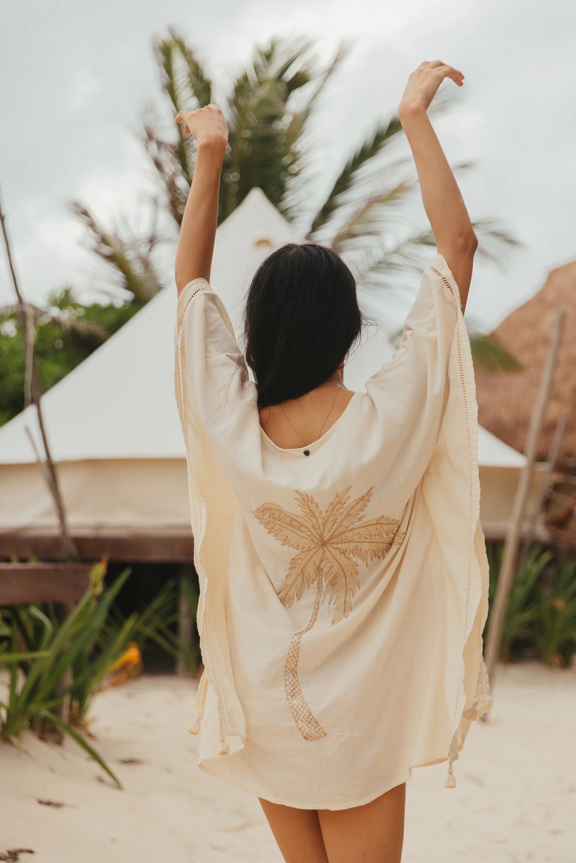 Float through paradise in our Palmier Cover Up from Rest Aura Resort '24. This ethereal piece showcases exquisite golden palm embroidery against pristine natural cotton, creating a perfect balance of sophistication and ease.