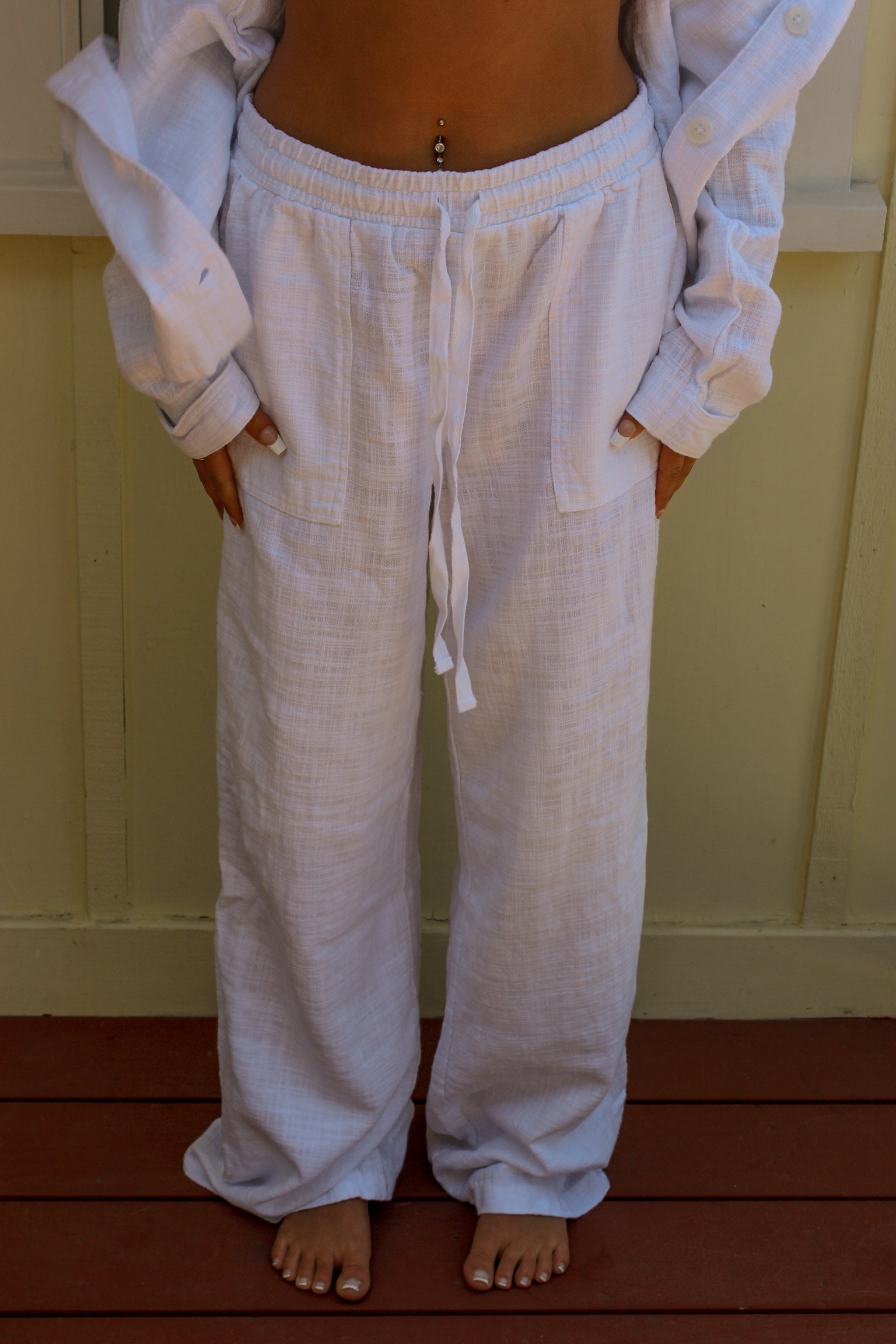 A wide leg silhouette and woven slub fabrication combine for an ultra-comfortable staple. Pair with a tank or any resort-ready top for an effortless, yet pulled together, look.