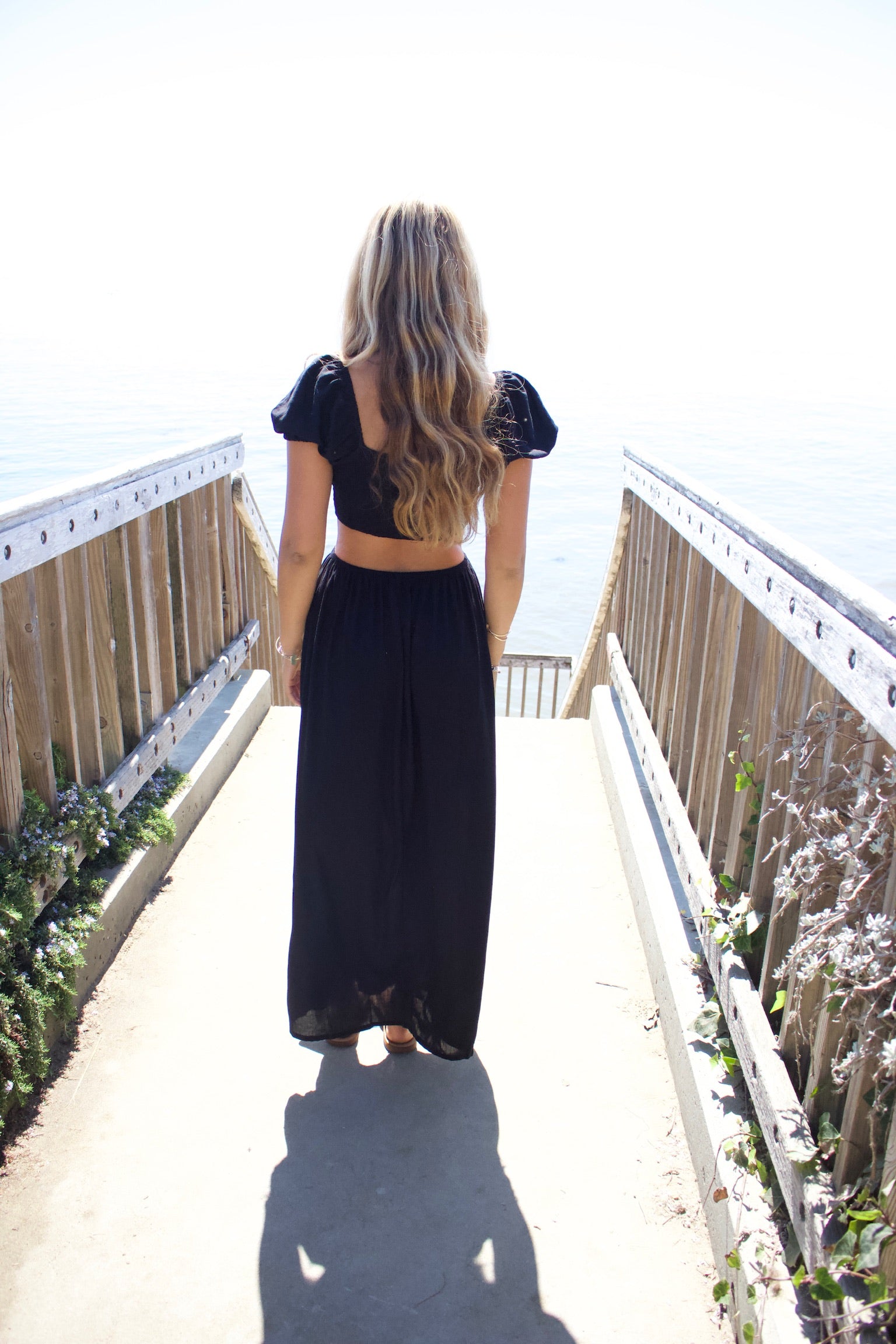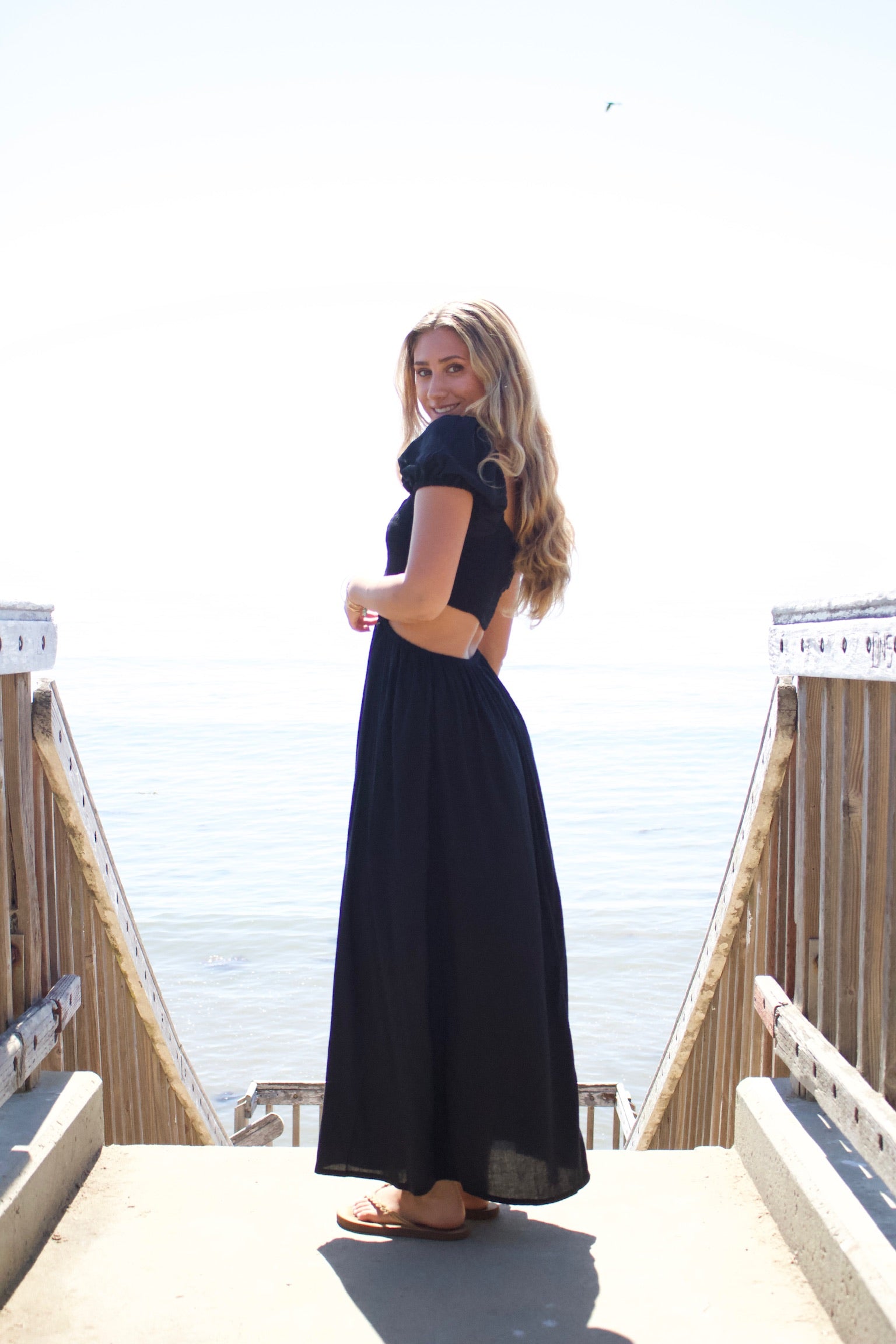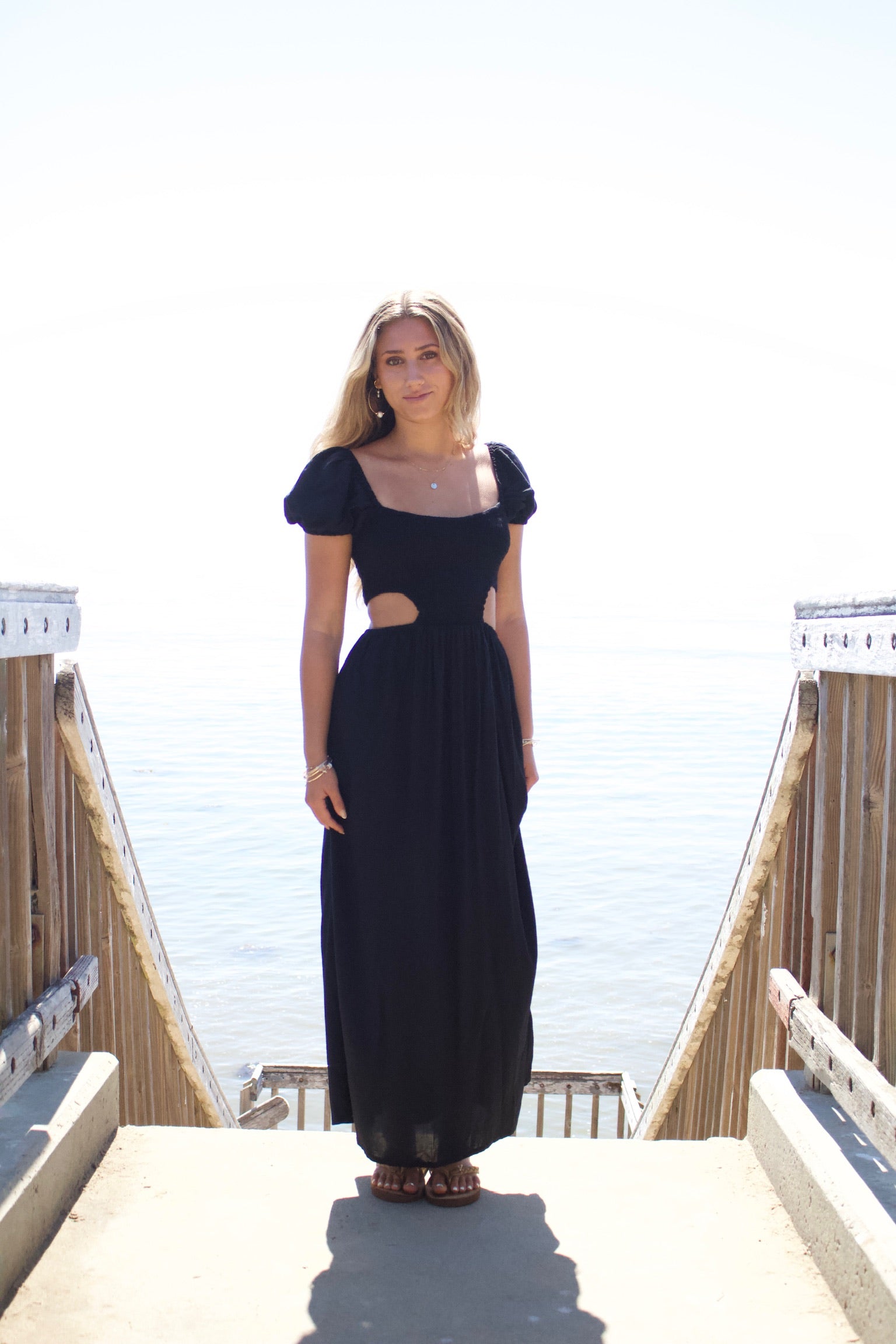 Long Black dress smocked on top with side cutouts.