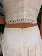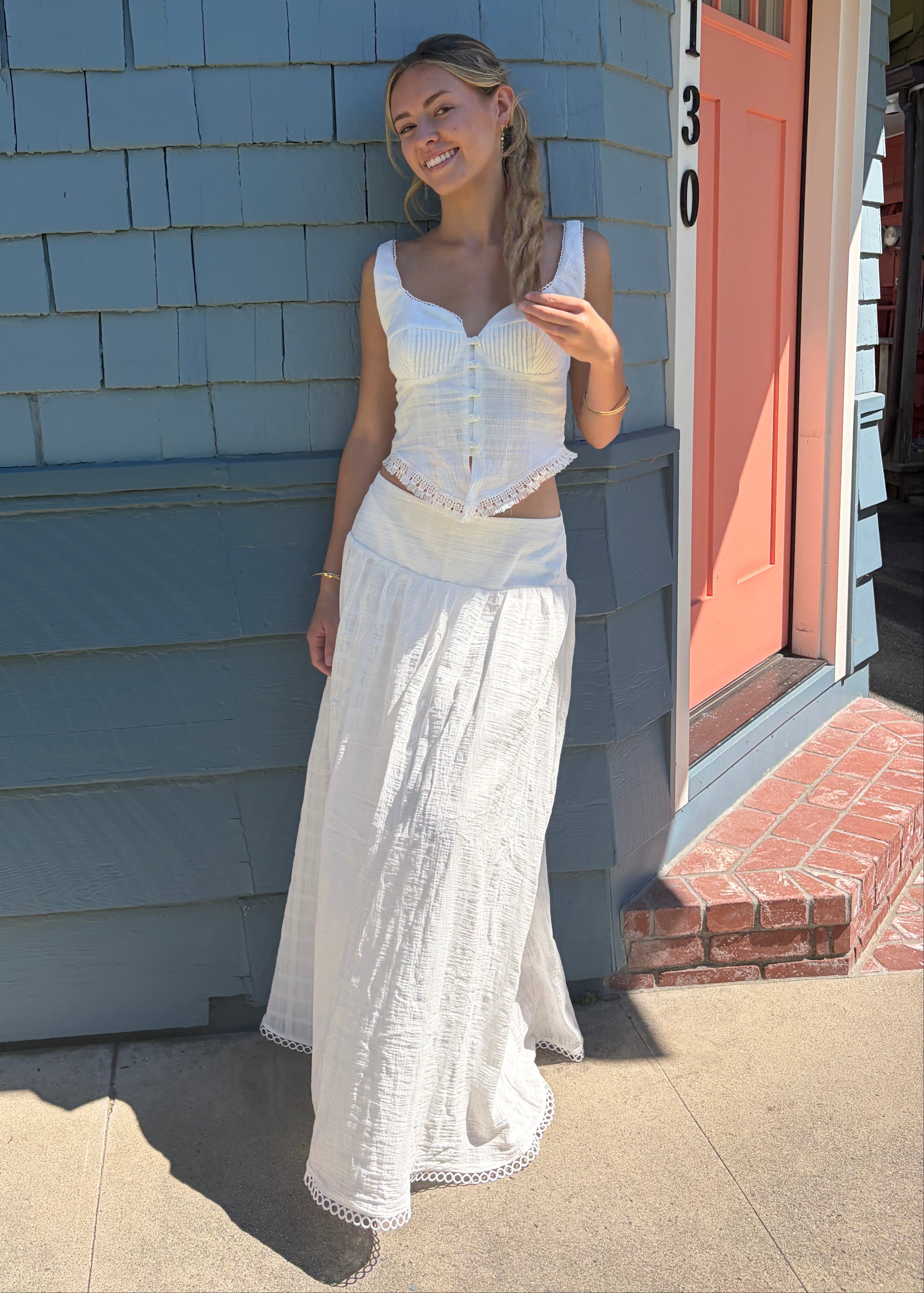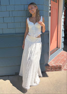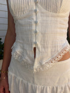 The Lucia Corset Top is a romantic, structured silhouette. Featuring a flattering corset inspired bodice with delicate shaping and soft ruching at the cups, Lucia defines the waist while maintaining an effortless, wearable feel. Subtle trim detailing adds a touch of vintage charm. Designed as part of a two piece matching set, it pairs back beautifully to the Camila Maxi Skirt for a coordinated look that feels elevated, modern, and perfect for vacations, garden parties, and warm weather occasions.