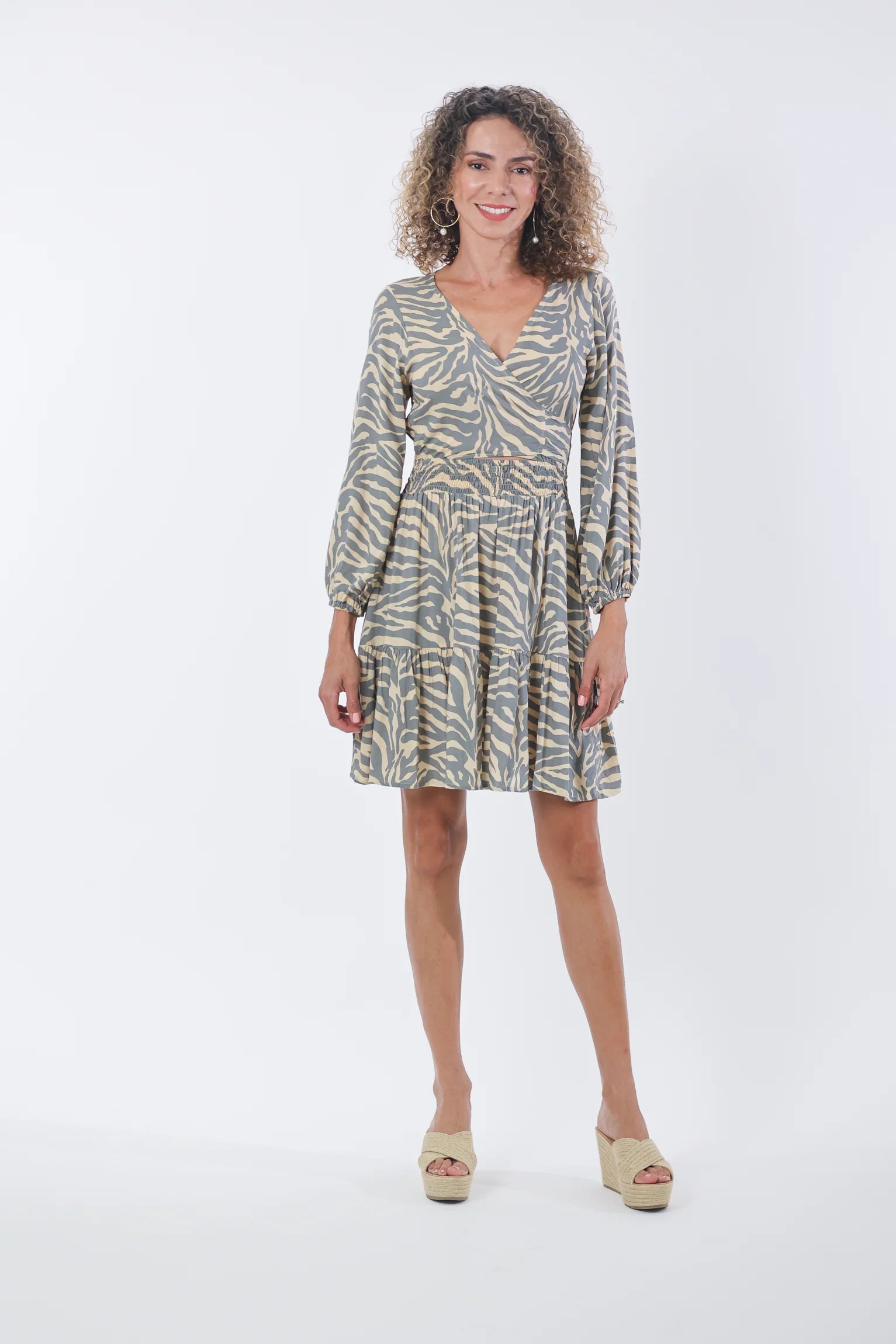 The Talia Mini Dress features a front tie at the bust, balloon sleeves, elastic waist band and mini skirt. Switch up your look by wearing as a traditional wrap or tying in the front (tip: tie around the bridge of your bra for full coverage).