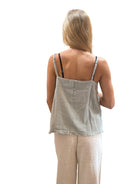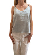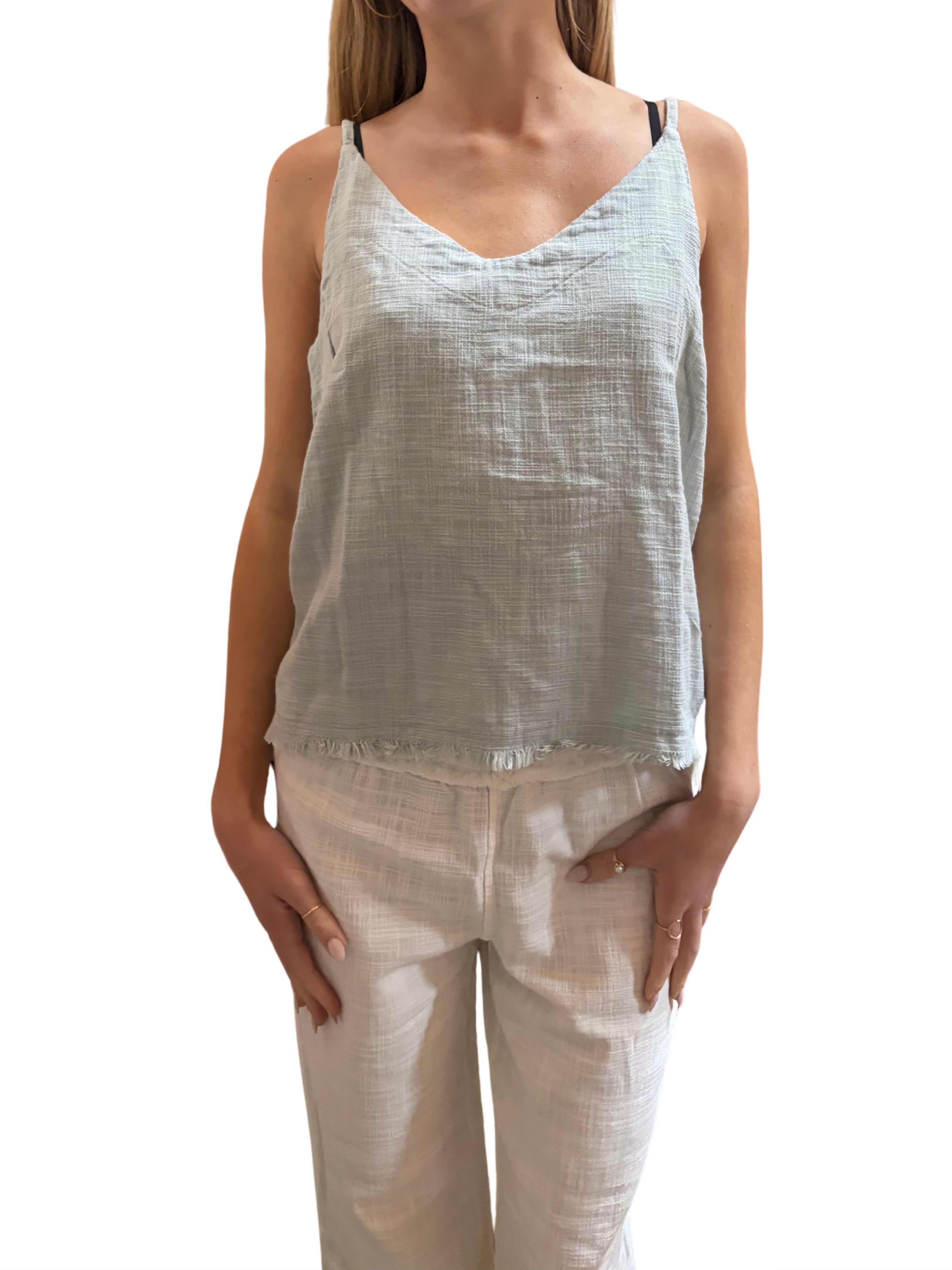 Camisole with adjustable straps and a v-neck. Featuring frayed edges
