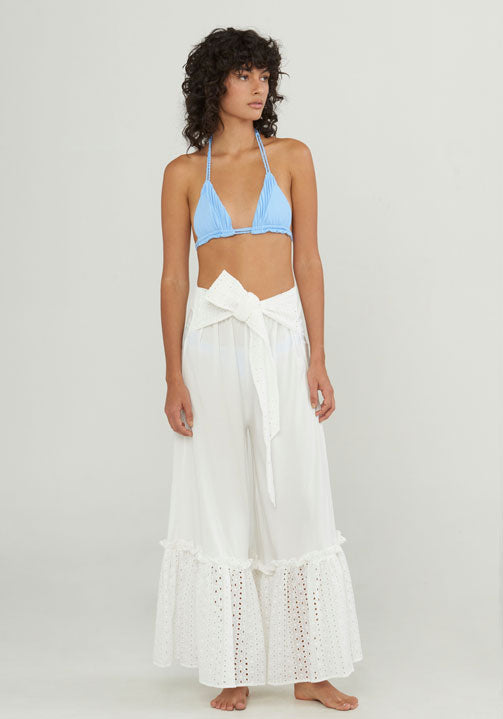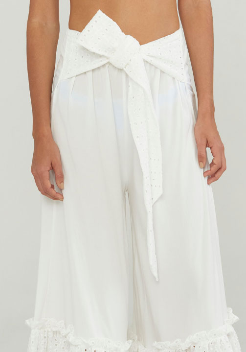 These white eyelet lace beach pants are perfect for lounging in style, crafted from premium quality cotton, and featuring a wide-leg silhouette that allows for easy movement and ensures maximum comfort. Their intricate eyelet lace design adds a touch of femininity and elegance, making them a versatile piece that can be dressed up or down.