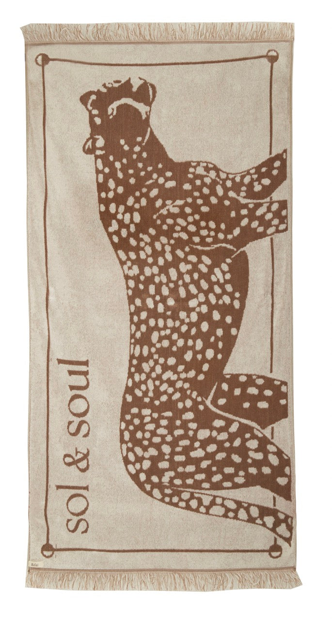 Make a statement with this leopard print towel, featuring the slogan 'Sol and Soul." Soft, absorbent, and 70 x 140 cm in size, it’s perfect for the beach. Fringes add an elegant touch to this 500g towel. Style meets comfort!
